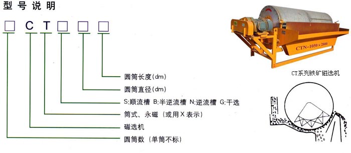 一、概述: 永磁筒式磁選機適用于礦山、選煤廠等單位,用于弱磁場濕式選別細(xì)顆粒的強磁性礦物,或者除去非磁性礦物中混雜的強磁性礦物。 該機有三種槽體:半逆流槽(CTB);順流槽(CTS)和逆流槽(CTN),分別適用于不同選別顆粒度及不同選別工藝的要求。 我公司產(chǎn)品的特點是:采用計算機優(yōu)化設(shè)計,磁路合理并嚴(yán)格選用高矯頑力,高剩磁的永磁體,確保磁性在長時間內(nèi)不降低,保障用戶的長遠利益,整體結(jié)構(gòu)可靠耐用,分別適用于不同選別顆粒度及不同選別工藝的要求。 該機是專門為重介質(zhì)選煤廠回收磁性介質(zhì)設(shè)計的全逆筒式磁選設(shè)備。該系列設(shè)備的磁場的分布特征有利于微細(xì)粉的最大回收效果,巧妙設(shè)計了分選設(shè)備中產(chǎn)生合理礦漿流向的相應(yīng)結(jié)構(gòu),使磁性礦物的回收率大大提高,該設(shè)備對物料流量、濃度等參數(shù)變化的適應(yīng)性強,廣泛用于重介質(zhì)選煤廠。 工作原理: 該類設(shè)備利用永磁磁系所產(chǎn)生的磁力,將礦漿中的磁性礦物吸引到圓筒表面上來,并隨著圓筒一起旋轉(zhuǎn),待脫離磁場作用后在重力、(刮板)作用下,排出機外,而非磁性物料從尾礦口排除,完成分選作用。