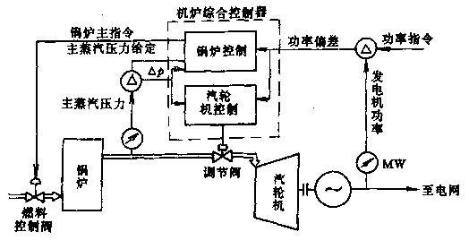 圖6-3汽輪機(jī)、鍋爐協(xié)調(diào)控制  為使中間再熱機(jī)組在負(fù)荷變化時,既能利用鍋爐金屬的蓄熱滿足快速響應(yīng)外界電負(fù)荷的要求,又能通過改變調(diào)節(jié)汽門的開度使主蒸汽壓力的波動在允許的范圍之內(nèi),從而要求機(jī)爐采用協(xié)調(diào)控制方式。機(jī)爐協(xié)調(diào)控制的流程圖如圖6-3所示。 為改善中間再熱機(jī)組的啟動特性,加快機(jī)組的啟動速度,回收啟動過程中的工質(zhì)和熱量,以及在機(jī)組甩負(fù)荷工況下保護(hù)鍋爐的安全,在中間再熱汽輪機(jī)的蒸汽系統(tǒng)中設(shè)有高、低壓旁路系統(tǒng)和大旁路系統(tǒng)。高壓旁路系統(tǒng)是將來自鍋爐過熱器的新蒸汽通過減溫、減壓器排至冷汽液兩相流疏水器蒸汽管,低壓旁路系統(tǒng)是將再熱新蒸汽經(jīng)減溫、減壓器排至凝汽器,大旁路系統(tǒng)則是將新蒸汽經(jīng)減溫、減壓器直接排至凝汽器。在機(jī)組啟、停過程中,通過操作高、低壓旁路調(diào)節(jié)閥和中壓調(diào)節(jié)汽門,控制再熱蒸汽溫度和汽液兩相流疏水器的冷卻。在甩負(fù)荷工況下,由旁路系統(tǒng)控制鍋爐過熱器及汽液兩相流疏水器的壓力,避免鍋爐安全閥動作,使機(jī)組故障排除后盡快恢復(fù)運行。中間再熱汽的旁路系統(tǒng)及高、中壓主汽門與調(diào)節(jié)汽門的布置如圖6-4所示。
